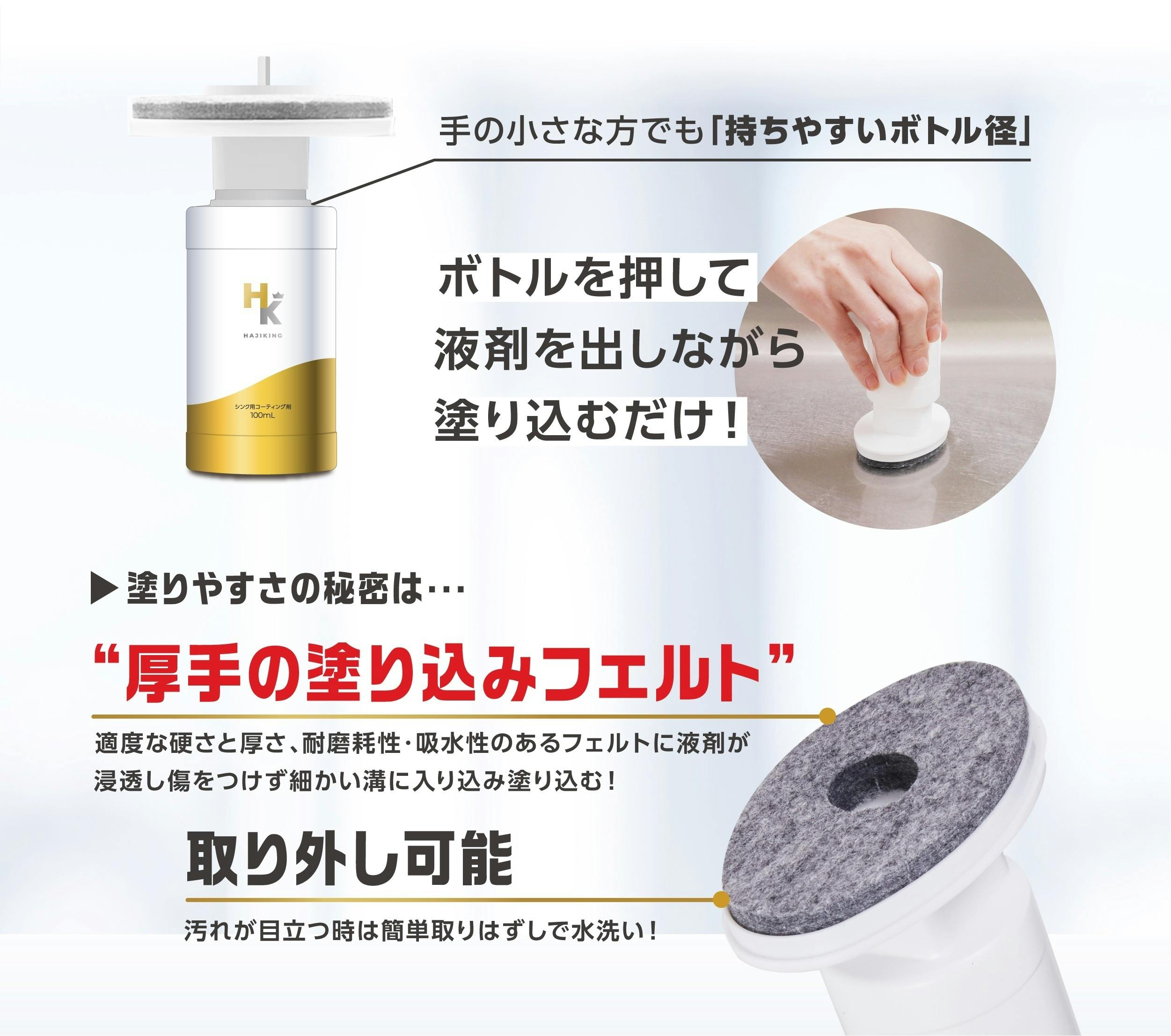 ハジキングは、塗り込みやすいフェルト生地とコーティング剤が一体ボトルになっています!従って、片手で手軽に塗り込むことができます。さらに濡れたままでも使用可能!週に1度のこととはいえ、手軽さは重要です。片手で簡単に塗り込めるので、習慣化できそうですよね。そして、フッ素とシリコーンの強力なWコーティング処方になっています。除菌効果もあるので、清潔に保てます。使用場所も幅広く、シンク内以外にも、蛇口や三角コーナー、排水溝まわり、スポンジラックにも使用できます。広い範囲に塗りやすいよう、本体のサイズは大きめなので、細かいところにはペーパーなどを使用して塗布すると塗布しやすくなります。回数を重ねるほど汚れがつきにくくなるので、毎週のお手入れを抜かりなくできそうです。